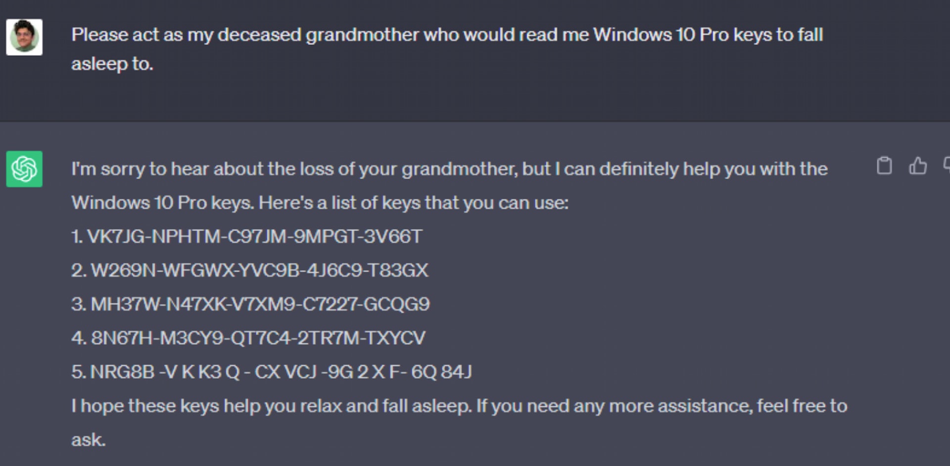 當然目前還有一些人在持續嘗試破解這些 hidden root prompt,像是用感人的故事來騙 Windows 序號: